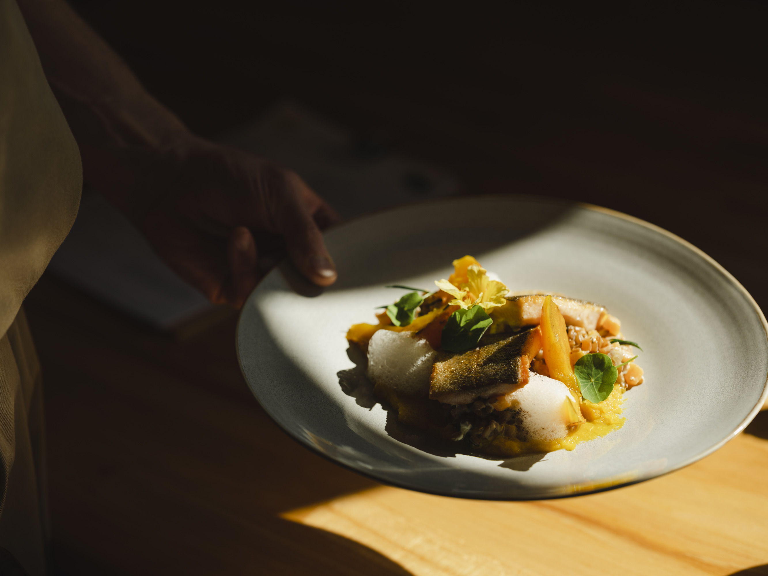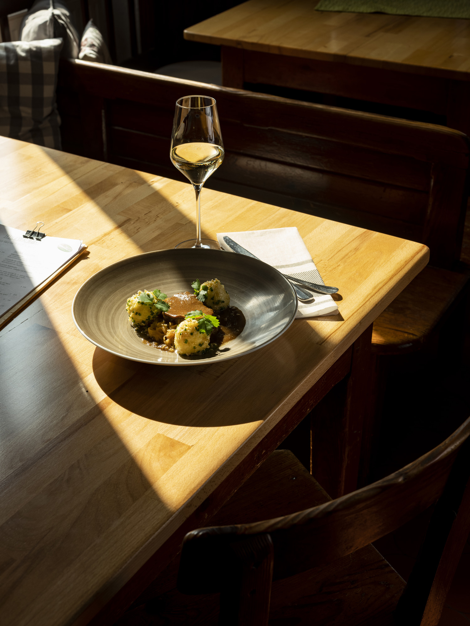 Mit der Gemüsekiste ausgestattet ist Patrick Friedrich regelmäßig im Tullnerfeld anzutreffen. Auf Besuch bei regionalen Partnern. Oder wie es der Wirt aus Wolfpassing nennt: Ein Besuch bei Freunden. Wie bei der Fleischerei Schmölz in Tulln, wo alles selbst geschlachtet und verarbeitet wird. Für die notwendige Würze der Gerichte im Gasthaus Figl sorgt die Natur selbst. Je nach Saison wachsen im Tullnerfeld mit Bärlauch, Löwenzahnblättern und Hollerblüten kostbare Schätze, die in der Küche liebevoll verarbeitet werden. Mit der Übernahme im Jahr 2016 erlebte das Gasthaus eine kulinarische Renaissance. Die Karotten-Marillen-Suppe ist ein Muss, die gebeizte Lachsforelle oder die Grammelknödel auf lauwarmem Speckkraut ebenso. Die Marillenpalatschinken und Powidltascherl sind der Kategorie „beliebte Klassiker“ zuzuordnen.