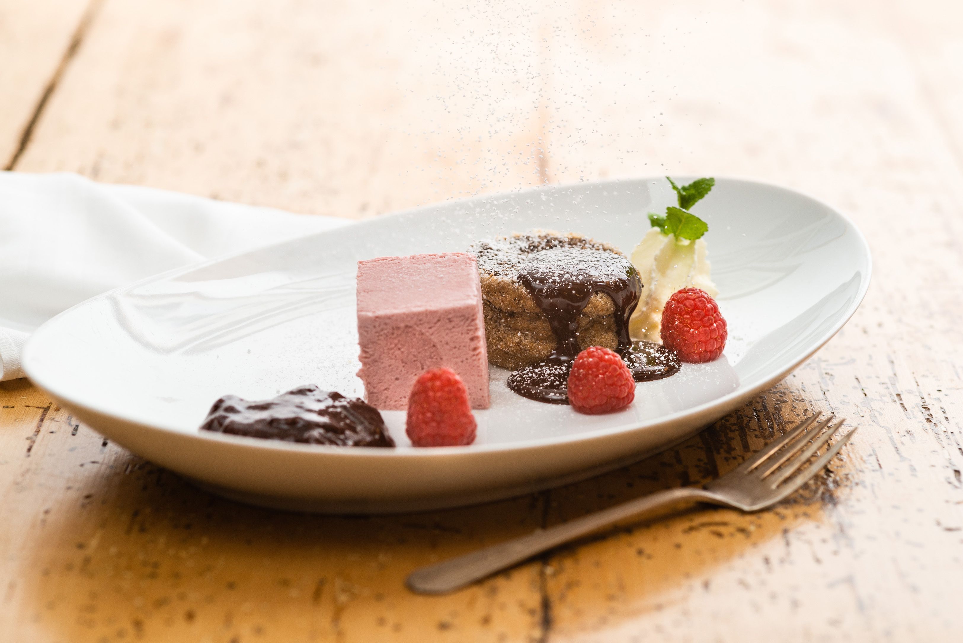 - Uhudlerparfait mit lauwarmen Mohn-Schokokuchen anrichten und servieren.